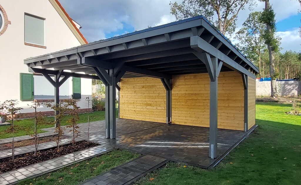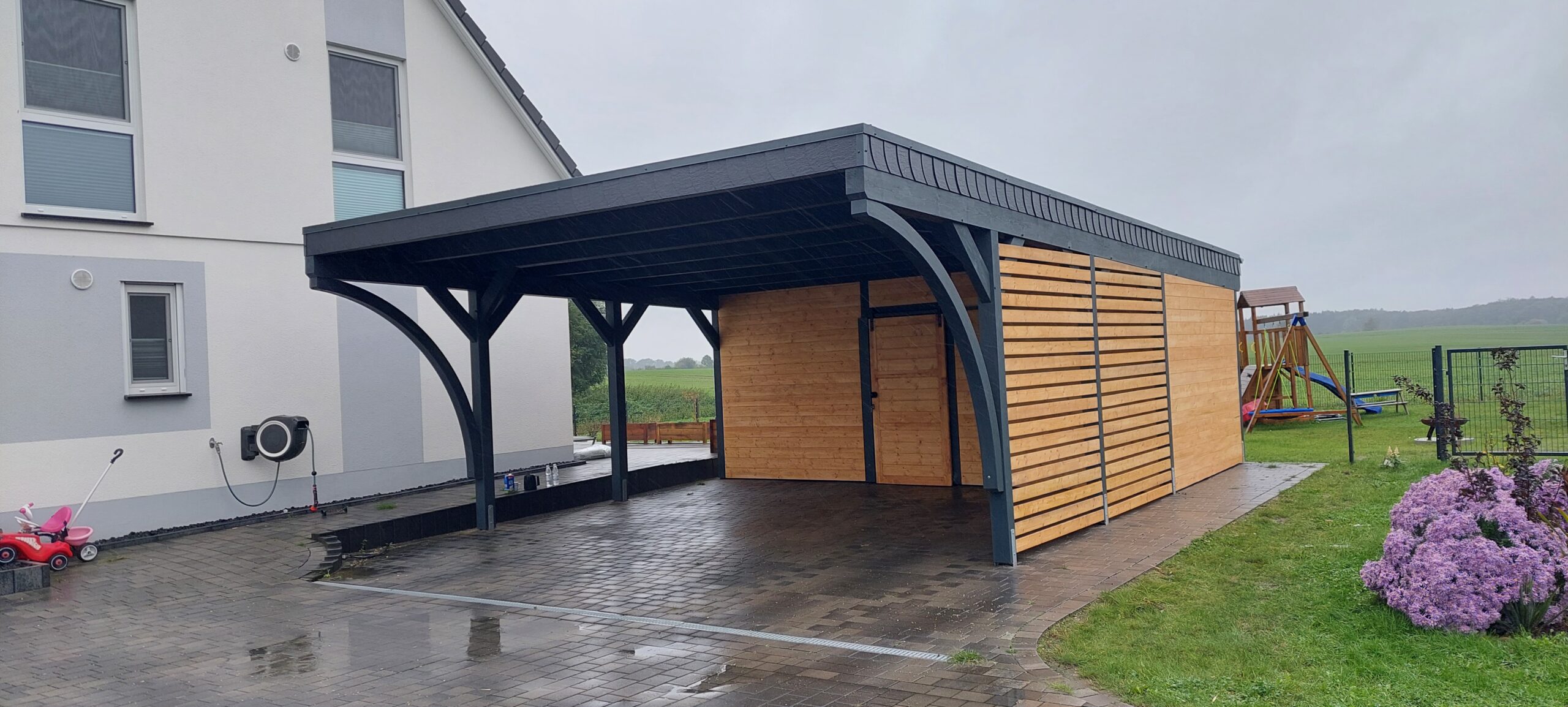 Der Carport mit Abstellraum bietet zusätzlichen Platz für Gartengeräte, Fahrräder oder Regale, wobei Größe und Position flexibel wählbar sind.